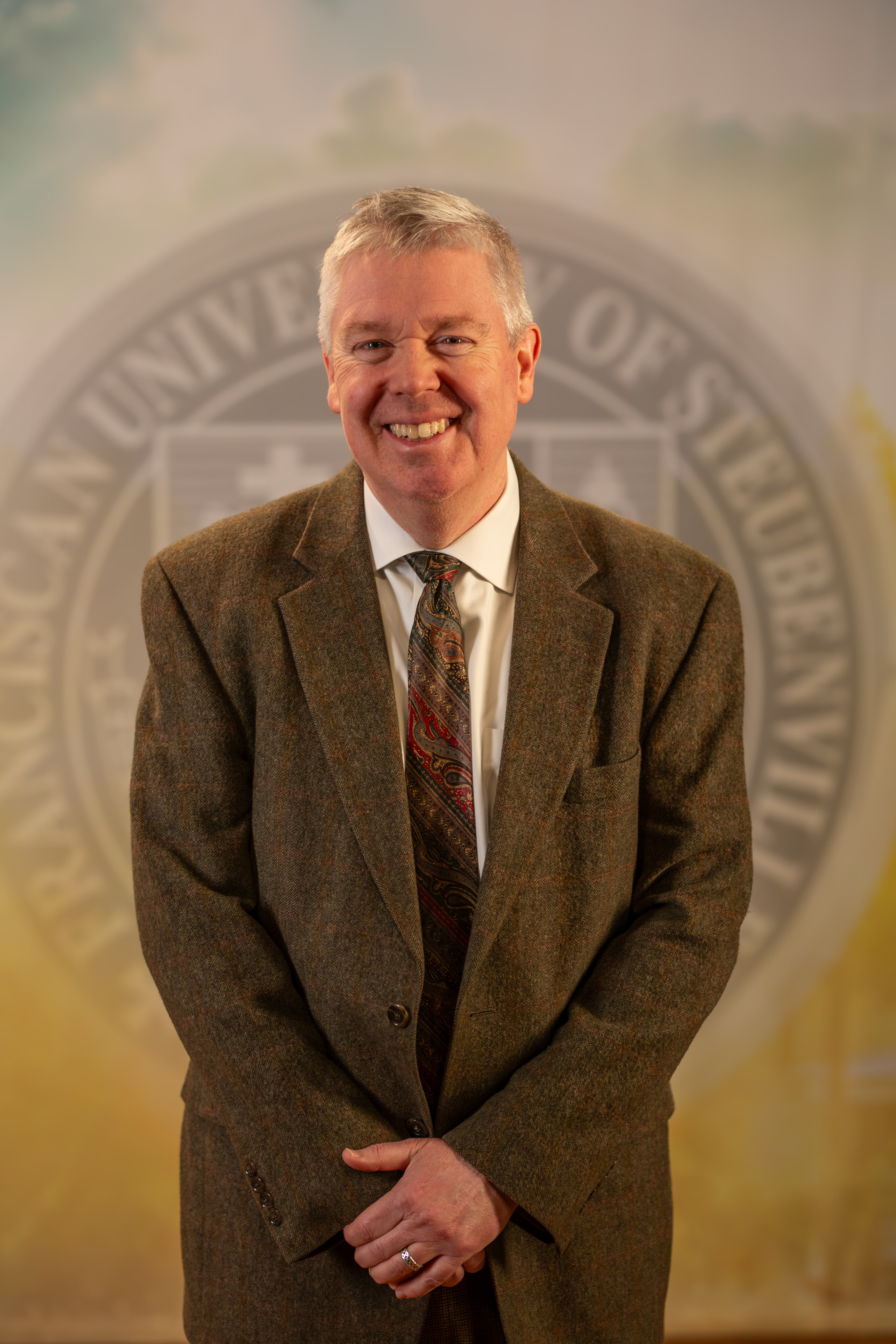 Dr. Matthew O’Brien standing in front of a university seal.